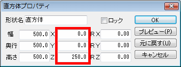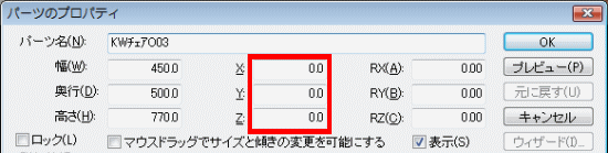 ■詳細パーツや形状をダブルクリックすると[プロパティ]ウィンドウが表示され、「X」/「Y」/「Z」には座標(配置位置)が表示されます。それぞれの座標の基準になっているのは、パーツを選択したときに表示されるピンクのポイントです。これを「配置基準点」といいます。 ■操作方法