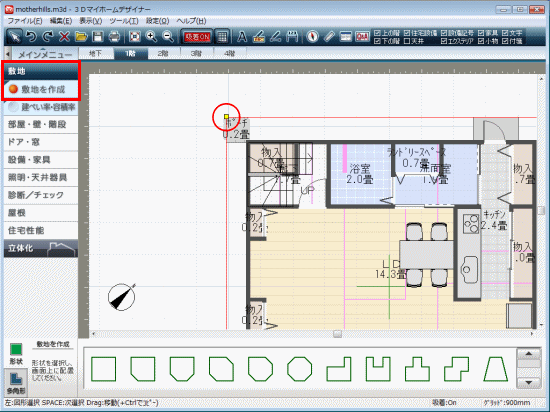 - ナビの[敷地]―[敷地を作成]を選択し、ツールバーが[吸着ON]になっていることを確認してから、敷地を「ポーチ」の角に合わせます。