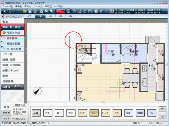 - ナビの[部屋・壁・階段]―[部屋を作成]を選択し、パレットから「ポーチ」の部屋を配置します。