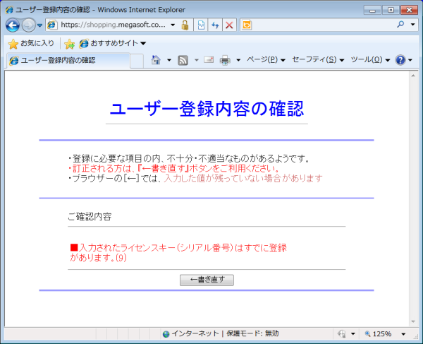 ■詳細オンラインのユーザー登録で、ユーザー情報を入力して確認画面に進むと「入力されたライセンスキー(シリアル番号)はすでに登録があります」と表示されて登録できない。 ■原因・対処弊社製品のユーザー登録は、所有されている製品につき1回ご登録いただければよろしいので、2回目のユーザー登録は必要ございません。 |