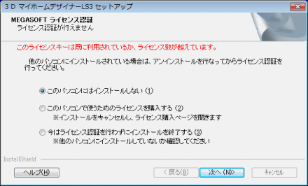 ■詳細この画面が表示されて、ライセンス認証がおこなえない。 ■原因ほかのパソコンに、同じライセンスキーでインストールされている。
