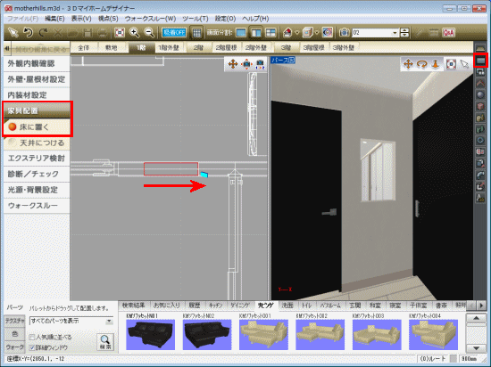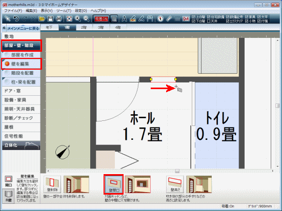 部屋にニッチを作成する一番簡単な方法は、あらかじめ間取り画面で壁編集の「壁開口」で開口部を作成しておき、立体化してから形状作成ツールの「壁」で開口部をふさぐ壁を作成してはめ込みます。