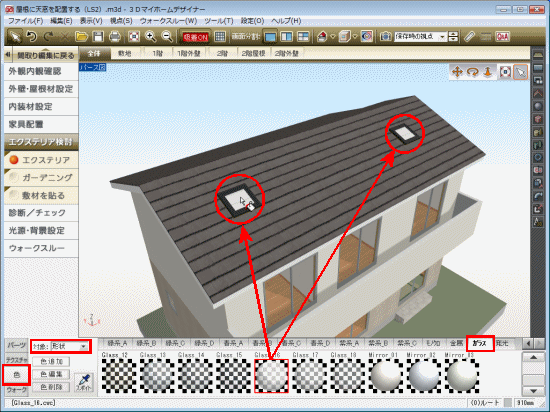屋根に天窓用のパーツを配置する方法です。天窓用のパーツは、FIX窓を利用します。