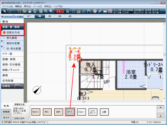 敷地と間取りとの間隔を合わせたい場合は、定規の代わりになる部屋を配置してから敷地の方を移動します。
