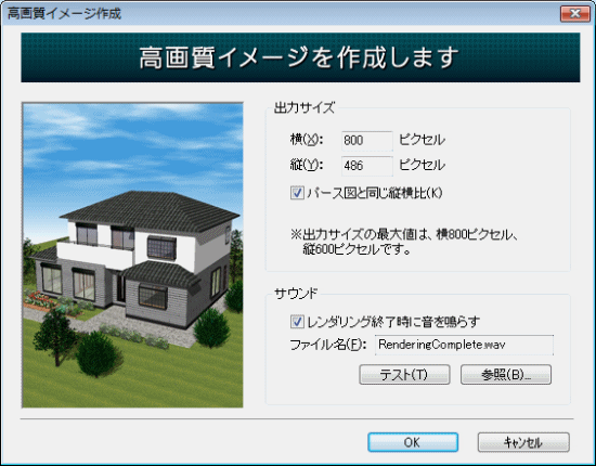 ご使用のパソコンに搭載されているビデオカードによっては、グラフィックスライブラリが「OpenGL」でしか利用できず、立体化したときにパース図が粗く表示されます。 そのため、[ファイル]メニューの[印刷]―[パース図]から印刷したパース図は、表示されている状態がそのまま印刷されるので、印刷結果も粗くなります。 その場合、「高画質イメージ作成」機能で一旦きれいにレンダリングした画像を印刷してください。 【OpenGLモードのパース図】 【高画質イメージ作成で出力されたパース図】