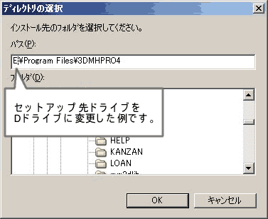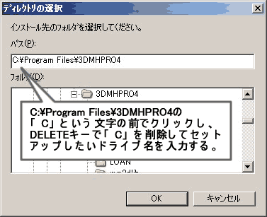 [ディレクトリの選択]ウィンドウが表示されますので、セットアップ先ドライブ名のみを消して、セットアップしたいドライブ名を半角で入力してください。