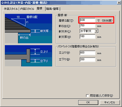 [立体化設定]の[屋根]タブをクリックし、勾配を8寸に設定します。