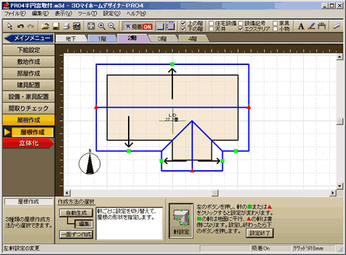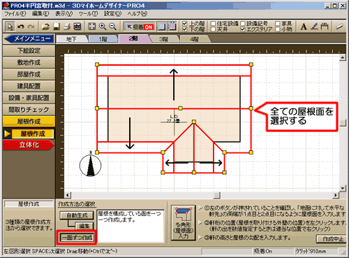 屋根を作成します。「屋根作成」−「屋根作成」ナビを選択します。