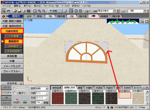 このときナビは「内装材設定」−「壁紙設定」を選択します。フロアタブを[3階]に切り替えてテクスチャをドロップして貼り付けます。内装材も同じように貼り付けます。