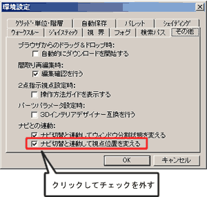 「その他」タブをクリックし、ナビとの連動の「ナビ切替と連動して視点位置を変える」のチェックを外します。「OK」ボタンをクリックして設定します。