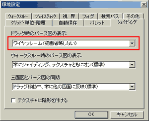 次に 「ドラッグ時のパース図の表示」で【ワイヤーフレーム(描画省略しない)】を選択します。OKボタンをクリックします。