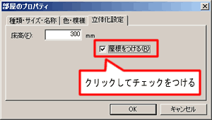 [部屋のプロパティ]が表示されます。「立体化設定」タブをクリックし、「屋根をつける」をクリックしてチェックをつけます。設定が終わったら「OK」をクリックします。