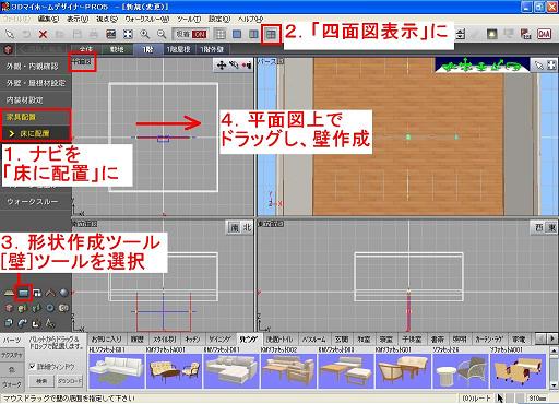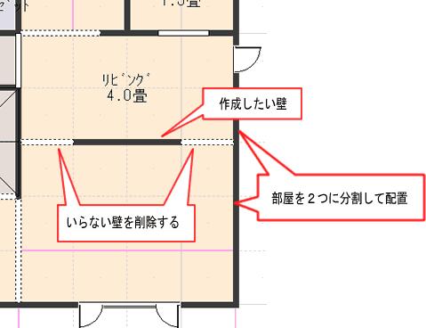 部屋に仕切りなどの一枚壁を入力したい場合は、2通りの作成方法があります。 ■ 「間取り画面」で作成する 「間取り画面」では壁1枚のみを作成することができませんが、部屋を分割して配置し、残したい部分以外を「壁削除」することで1枚壁とすることができます。 ■ 形状作成ツールで作成する 立体化した後に形状作成ツールで壁を入力する方法で壁を表現します。