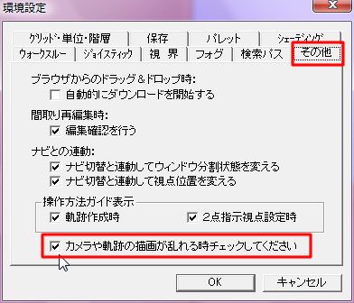 最下行にある「カメラや軌跡の描画が乱れる時チェックしてください」のチェックボックスをクリックしてチェックをつけます。 |