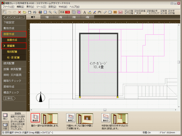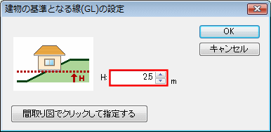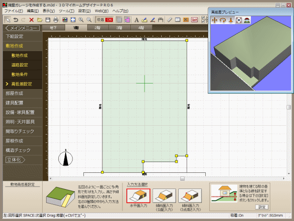 建物の基準となる線(GL)を設定し、敷地の高低差設定で擁壁を作成して「地下」のフロアにインナーガレージの部屋を配置して擁壁ガレージを作成できます。 ここでは、擁壁2.5mの敷地に高さ2200mmのガレージを作成しています。