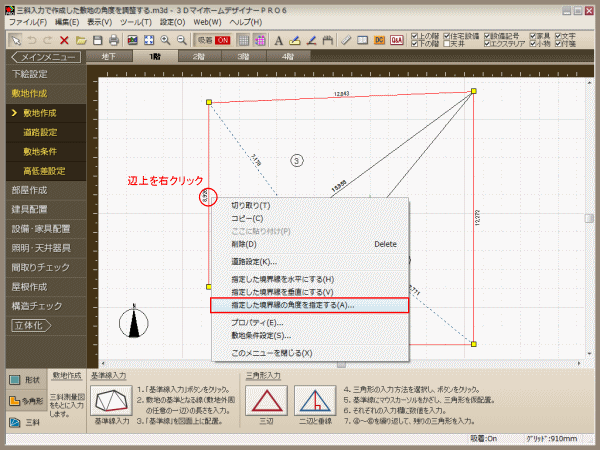 三斜で作成した敷地の角度を調整するために、基準になる辺を右クリックして「指定した境界線の角度を指定する」をクリックします。