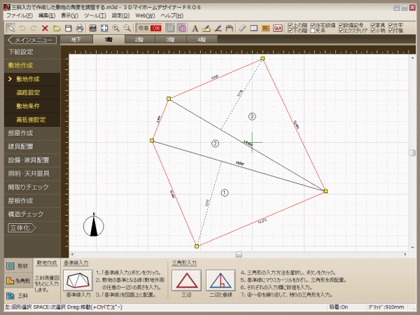 間取り画面のナビの[敷地作成]−[敷地作成]を選択し、パレットを[三斜]に切り替えて敷地を作成します。