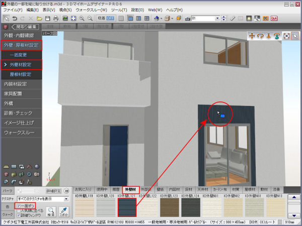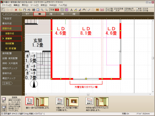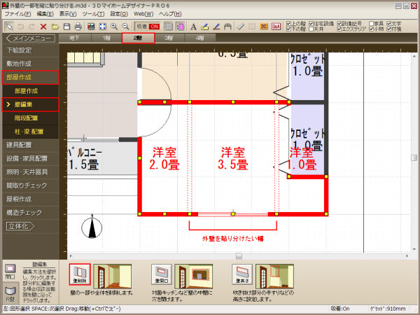 「一面ずつ」のチェックをオンにして外壁にテクスチャを貼り付けると、壁一面ずつにテクスチャを貼り付けることができます。 この外壁の「一面」は、間取り画面で作成した部屋のサイズで分けられます。 そのため、2階建の建物で1階から2階まで同じ幅のテクスチャを貼り付ける場合は、間取り画面で部屋を作成するときに1階と2階で部屋を同じ幅で分割して作成します。