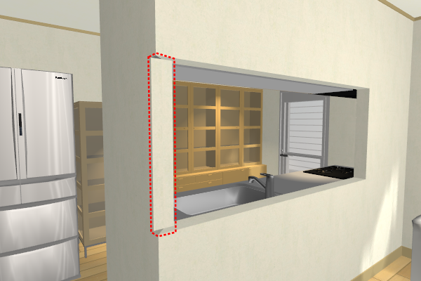 壁編集の[壁削除]や[壁開口]で、壁の角まで壁編集をしたとき、角の部分まで壁が削除、または開口されます。 その部分をきれいに仕上げるには、間取り画面で配置する「四角柱」を利用して、削除、または開口された角を埋めます。