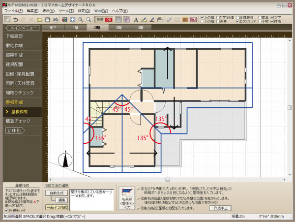 同じ屋根勾配で寄棟の屋根面を作成する場合、次のことに注意して作成しなければ、同じ屋根勾配、正しい軒桁の高さ設定しても、立体化した際に、正しく表現されません。 上の図のように、隣接する屋根面の底角が各45度、合計90度(内角)になるように作成してください。 平行四辺形、台形の屋根面に関しては、片方の底角が45度、対する底角が135度、合計180度(外角は90度)になるように作成してください。 正しい角度で屋根面を作成し、軒桁の高さを設定して立体化すれば、屋根は正しく寄棟状に組み合います。 ≪作図例≫ ≪3Dイメージ≫