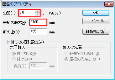 勾配、軒桁の高さは作例の数値です。実際にデザインする建物の勾配、軒桁の高さを求めて設定してください。