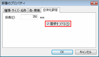 - 部屋のプロパティ]が表示されます。「立体化設定」タブをクリックし、「屋根をつける」をクリックしてチェックをつけて[OK]をクリックします。