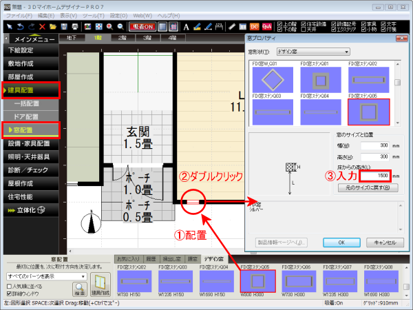 ナビの[建具配置]−[窓配置]を選択し、パレットから配置したい窓を選択して壁に配置します。