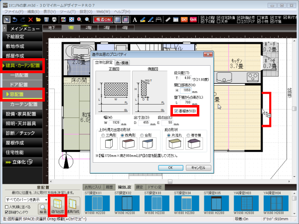表示された[造作出窓のプロパティ]で、[開口部高さ]や[壁下端からの高さ]などを設定し、[基礎あり]のチェックをオンにして[OK]をクリックします。
