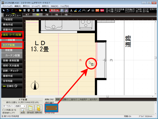 ナビの[建具・カーテン配置]−[ドア配置]を選択し、造作出窓の下に、収納のためのドアを配置します。
