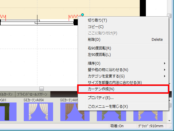 すでに窓に配置しているカーテンパーツを編集したい場合は、配置されているパーツをクリックして選択してから右クリックし、[カーテン作成]を選択します。
