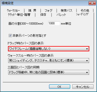 次に 「ドラッグ時のパース図の表示」で【ワイヤーフレーム(描画省略しない)】を選択します。