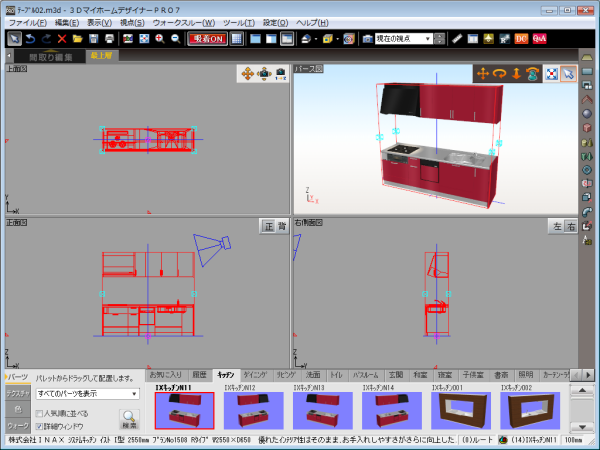 既存のパーツを利用する中で、「サッシの枠の色を変更したい」「ソファの一部を利用したい」「システムキッチンの上部の棚を削除したい」など、既存のパーツを編集したいことがあります。 その場合、パーツの階層に移動することで、パーツを一部を利用することができます。