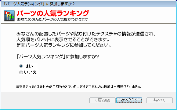 [パーツ人気ランキングに参加しますか?]画面から次に進めない |