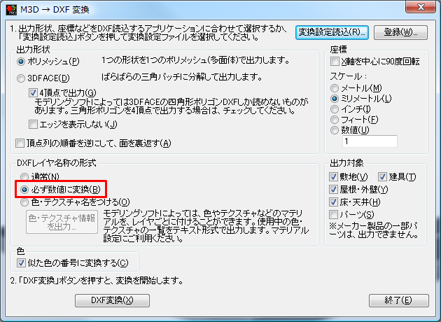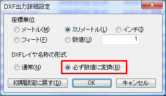 ■詳細DXF出力したファイルをAutoCADで読み込めない。 ■原因AutoCADの古いバージョンでは、レイヤ名に日本語が含まれていると読み込みできませんでした。 ■対処方法DXF出力する際、レイヤ名を「必ず数値に変換」に設定します。 間取りから出力する場合