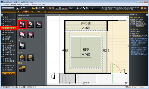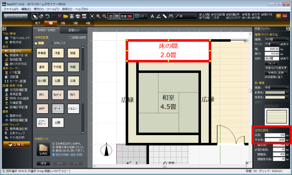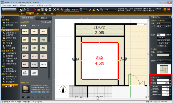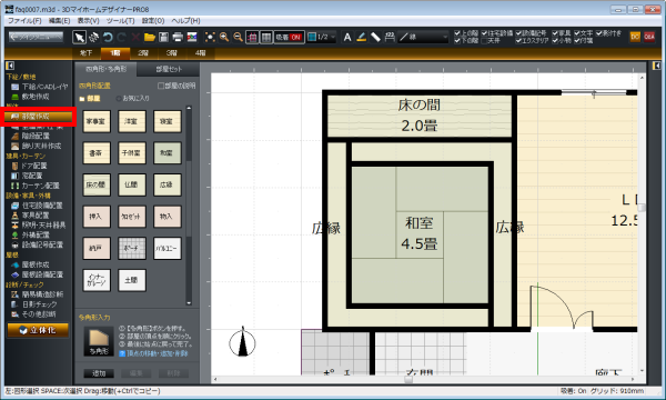 折上げ天井は、間取り画面で部屋を作成するときに、天井高に変更したい部屋とそうでない部屋とに分けて作成します。 ※「3DマイホームデザイナーPRO8 EX」では、簡単に折上げ天井が作成できます。