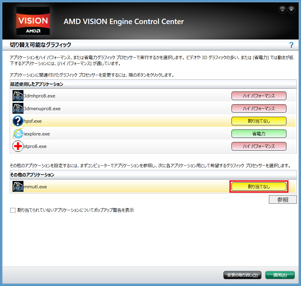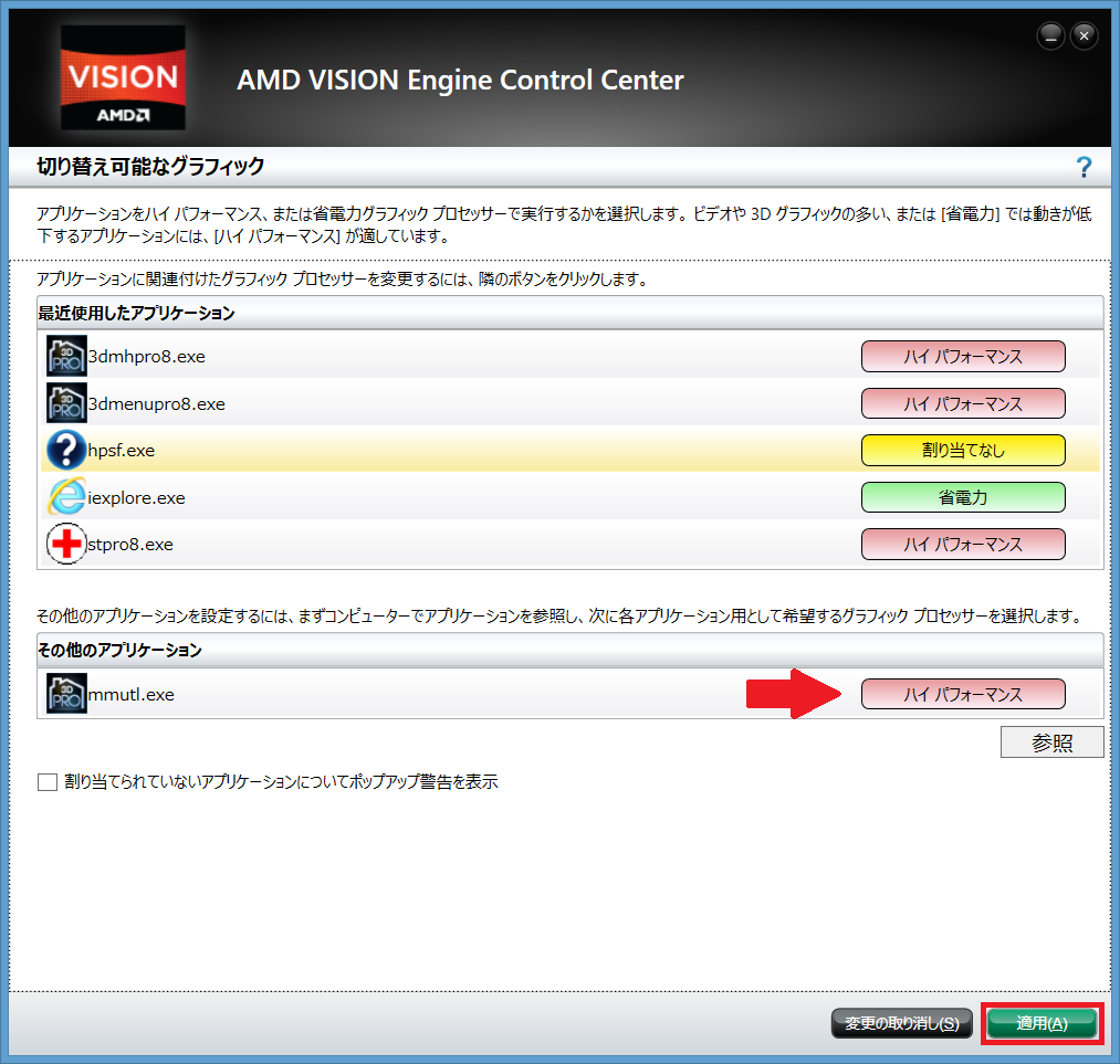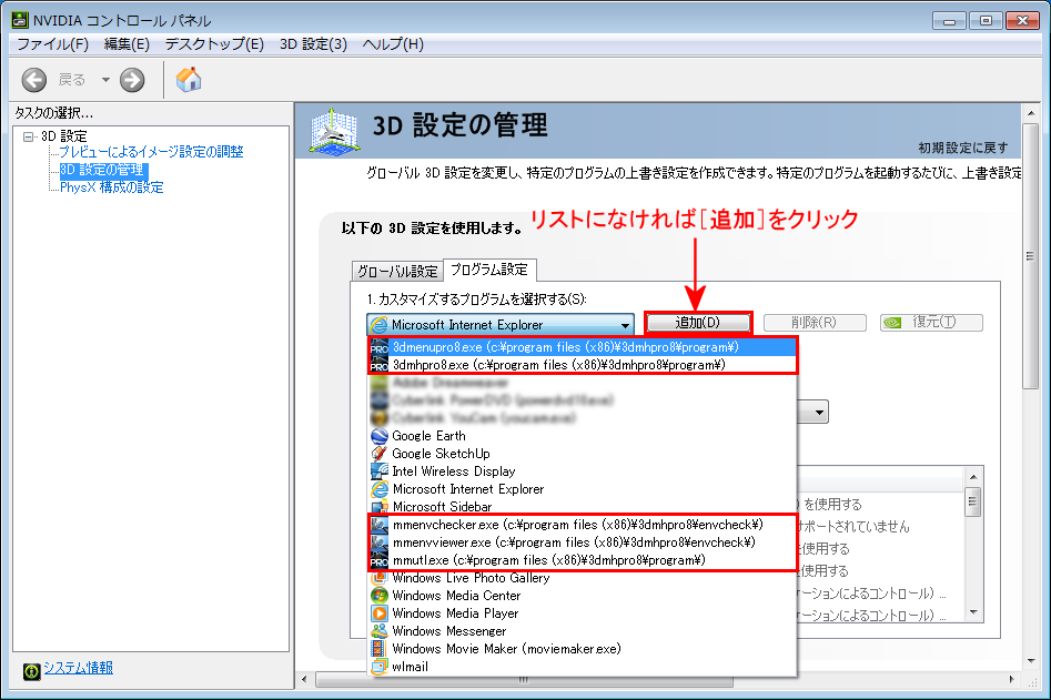 複数のグラフィックアクセラレータが搭載されたPC(例:Intel HD 4000とGeForceなど)の場合、自動的に高性能の方が使われるように、なっていません。3DマイホームデザイナーPRO8の実行形式ファイル(exe)を個別に登録する必要があります。
