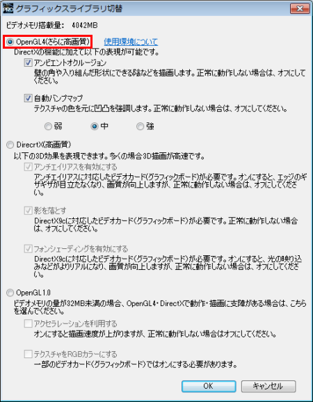 ■詳細「Intel(R) HG Graphics 4000」 搭載のコンピュータで、「OpenGL4」対応しているはずなのに、[動作チェックウィザード]でチェックしたところ、DirectXと判定された。 ■原因「Intel(R) HG Graphics 4000」 搭載のコンピュータでのテストの結果、「OpenGL4」では正常に描画できないことが多々ありました。そのため、[動作チェックウィザード]の自動判定では「DirectX」とさせていただいております。 ■対処方法「OpenGL4」で描画するには、次の手順でグラフィックスライブラリの設定を変更してください。