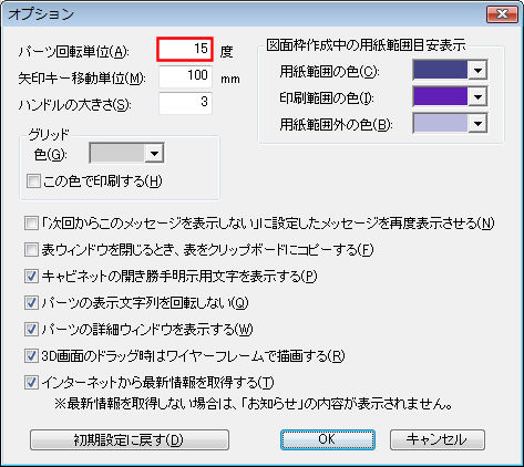3Dオフィスデザイナーでは、パーツのハンドルをドラッグして回転する角度が「15度」に設定されております。