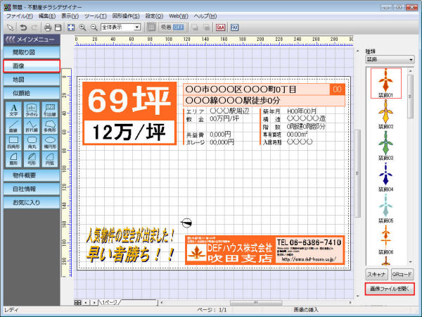 「不動産チラシデザイナー」を起動し、メインメニューの[テンプレートから作成]でテンプレートを開くか、[ファイルを開く]で作成中のファイルを開きます。
