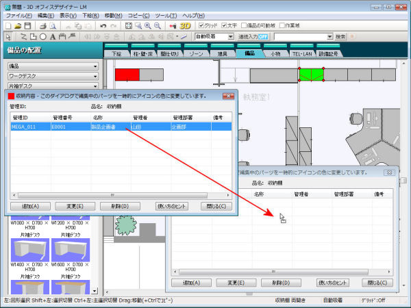 移動元の[収納内容]に表示されている収納物を移動先の[収納内容]に直接ドラッグします。