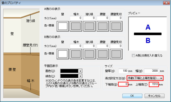 2. 下用の壁をダブルクリックし、表示された[壁のプロパティ]で高さ設定を「手動(下端と上端を指定)」に切り替え、下端高に「0」、上端高に「1510」と入力して[OK]をクリックします。
