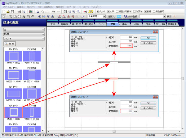 5. 配置したFIX窓をそれぞれダブルクリックし、表示された[建具のプロパティ]で、上用のFIX窓は配置高を「1710」、下用のFIX窓は配置高を「1000」と、それぞれ入力して[OK]をクリックします。