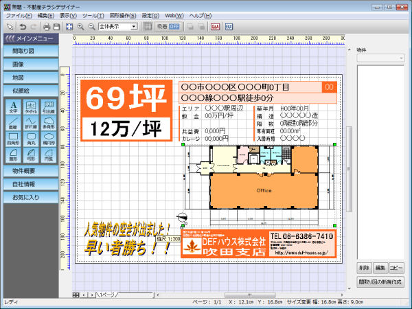 「不動産チラシデザイナー」を起動し、メインメニューの[テンプレートから作成]でテンプレートを開くか、[ファイルを開く]で作成中のファイルを開きます。