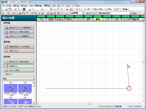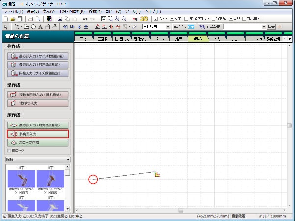 [柱・壁・床]レイヤに切り替え、壁作成の[複数枚同時入力(折れ線状)]や[1枚ずつ入力]、床作成の[多角形入力]ボタンをクリックします。