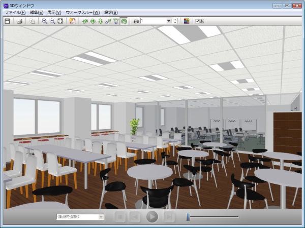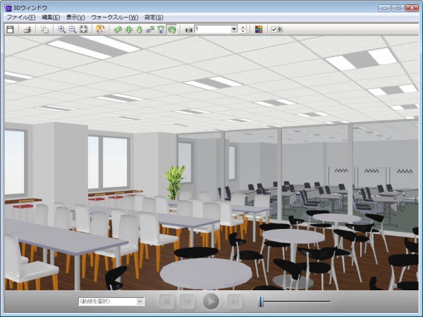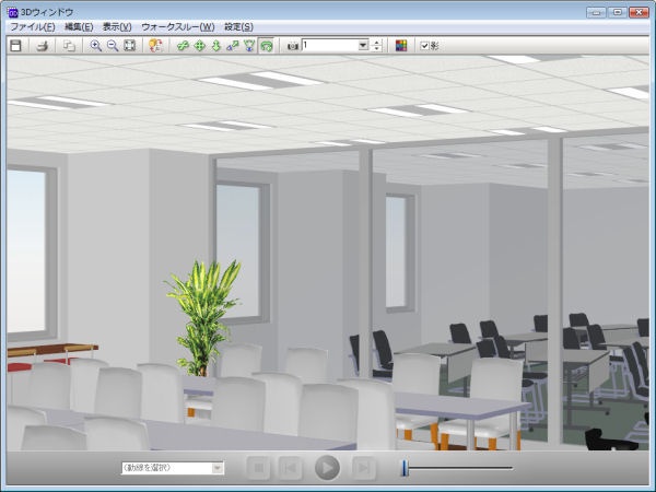 3Dウィンドウを起動した際、初期設定では画角が「30°(望遠)」に設定されています。 そのため、「ここからここを見る」機能や、3Dウィンドウで視点ツールを使って室内パースを表示した場合、視界が狭く感じます。 その場合は、3Dウィンドウの画角を広げることで視界も広がります。