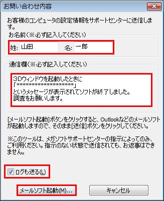 操作中にエラーが発生した場合、「サポートツール」を使ってサポートセンターにお問い合わせいただくと、ご使用のパソコンのシステム情報や使用ログ、エラーメッセージを一度に送信できるため、エラーの調査がスムーズにおこなえます。
