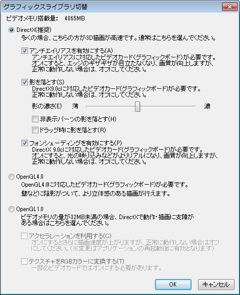 1)[OpenGL4.0]が選択されていたら、[DirectX]に切り替えます。