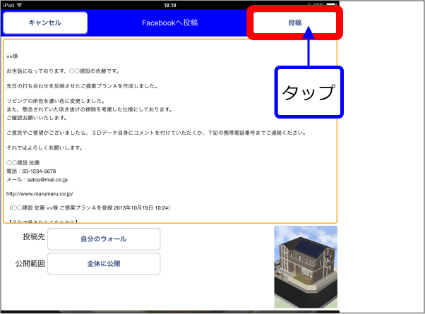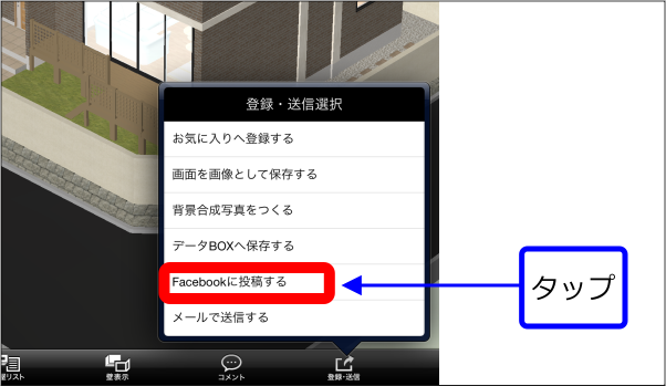 - 画面下部の[登録・送信]から[Facebookに投稿する]をタップします。