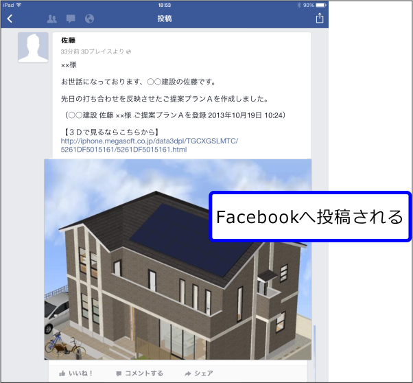 また、Facebookへ投稿された情報から、3Dプレイスビューアを使って3Dデータやコメントを直接見てもらうこともできます。
