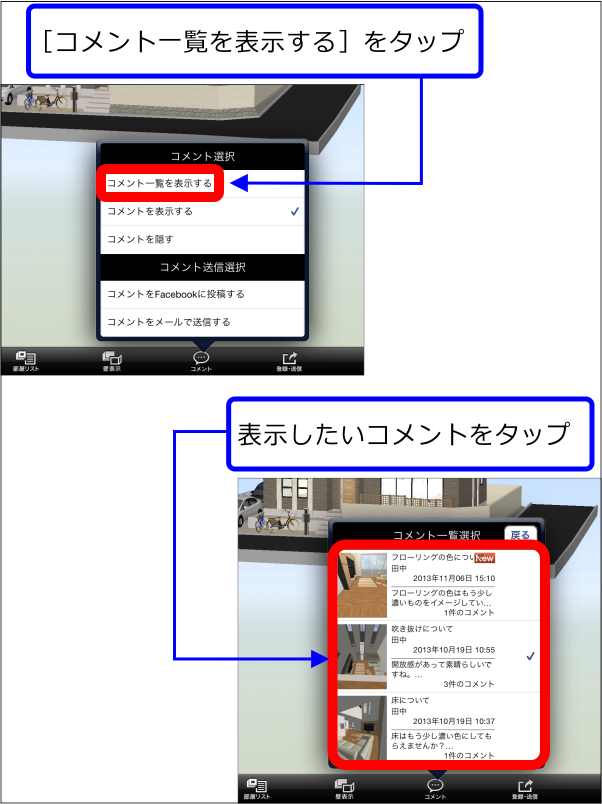 3Dデータに登録されたコメントは、コメント一覧から探します。